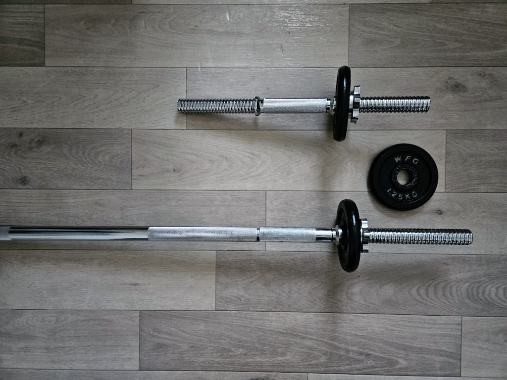 私が使用しているのは、シャフト(持ち手)にプレートを自分で組み合わせて重さを変える「スクリュー式ダンベル」です。